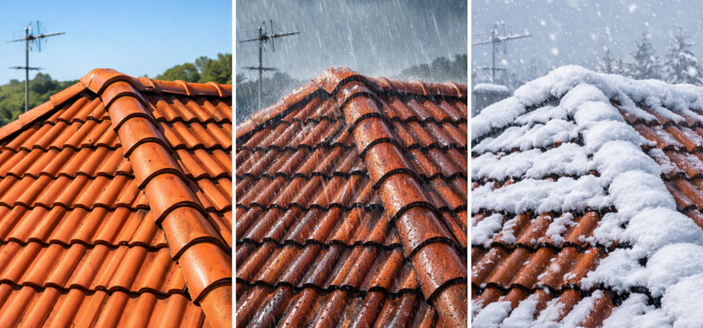 Soleil brûlant, pluie battante ou neige glaciale : votre toit encaisse tout, toute l'année. Sur cette image, on voit clairement ce q'un toit subit au fil des saisons .. et pourquoi il mérite un peu d'attention !