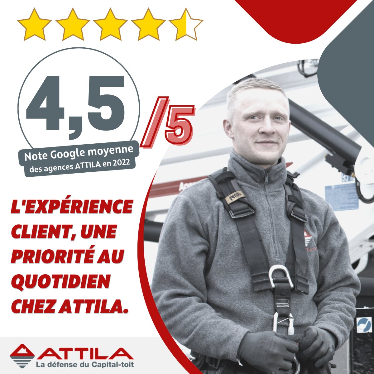 Les agences ATTILA ont reçu une note moyenne de 4,5/5 sur Google en 2022, et nous les remercions pour cette confiance. Ce chiffre reflète la forte implication de tous les collaborateurs du réseau pour la satisfaction de nos clients.