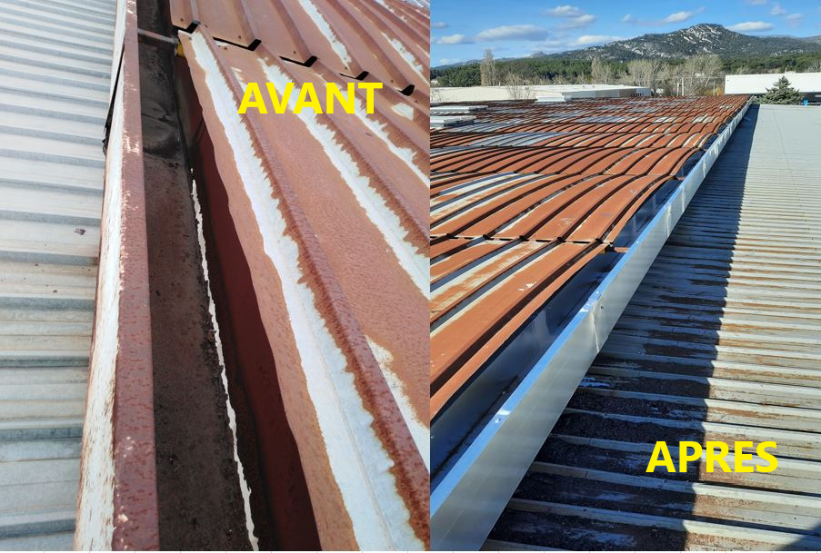 Dans certains cas, pour arrêter les infiltrations d'eau, nos couvreurs peuvent appliquer de la résine liquide sur le chéneau et ainsi le réparer. Malheureusement, dans ce cas, ce n'était pas possible, le chéneau était beaucoup trop délicat.