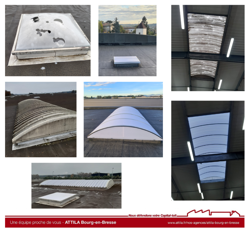 Les équipes de l’agence ATTILA BOURG-EN-BRESSE vous accompagnent et vous conseillent sur votre projet d’apport de lumière pour vos bâtiments ou habitations. Comme lors de cette intervention où il a été recommandé au client de remplacer complètement les lanterneaux et voûtes éclairantes après un épisode de grêle !