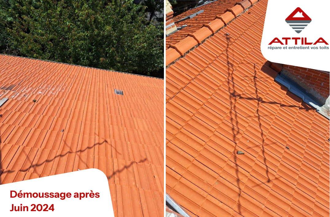 Au même titre que pour les toits inclinés, les toits-terrasses sont également à traiter régulièrement car la toiture se charge très rapidement en mousse et retient l’eau. C’est pourquoi ATTILA a choisi d’intervenir pour le démoussage de toiture avec un produit développé spécifiquement pour combattre la végétation et les mousses qui se développent sur ces terrasses étanchées..
