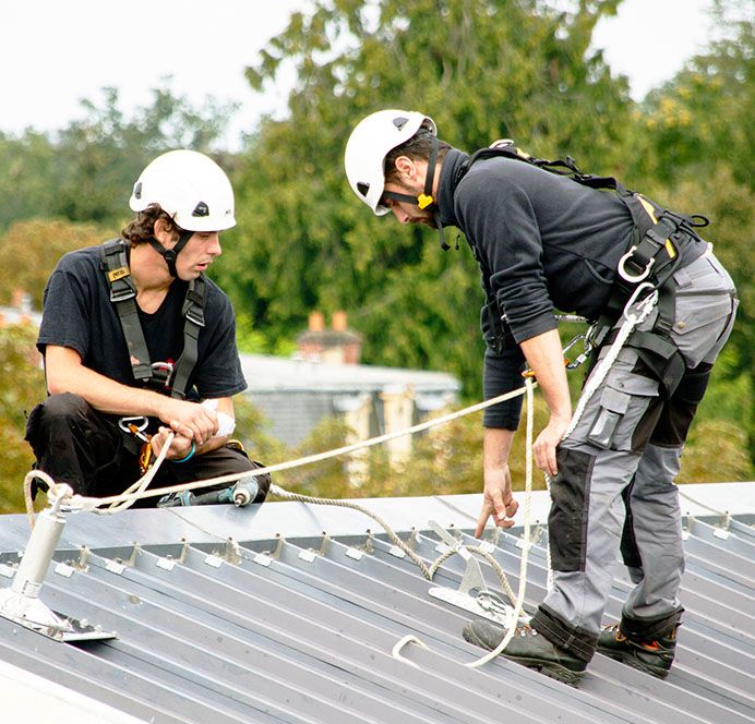 De plus, le harnais de sécurité fait partie de la tenue de travail standard de nos couvreurs-étancheurs. Cet EPI est un dispositif de maintien protégeant contre les chutes de hauteur. Il est relié à un ou plusieurs points d’ancrage créés par nos experts du travail en hauteur. Ces points d’ancrage peuvent être temporaires, afin de réaliser une intervention en sécurité, ou définitifs. Dans ce cas, ils répondent à la norme EN795.