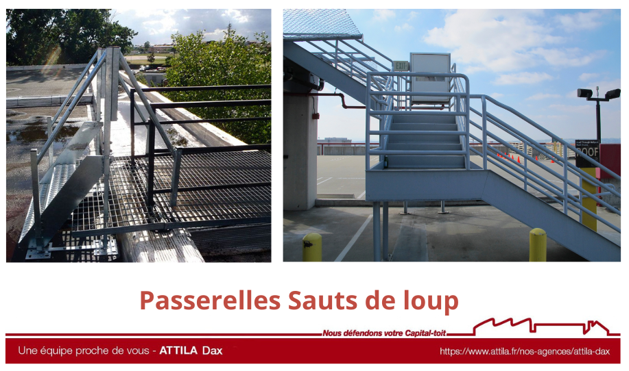 - ATTILA DAX, le remplacement et/ou la mise aux normes de vos passerelles et sauts-de-loup : Pour que ces dispositifs soient en conformité, nous créons, remettons aux normes voire nous remplaçons complètement vos passerelles de travail ou de circulation afin de créer ou renforcer la sécurité des intervenants amenés à circuler sur la toiture. Cela nécessite par nos experts une étude de l’environnement et du public amené à utiliser ces équipements de sécurité collective.