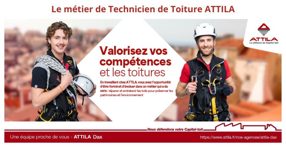 A l’agence ATTILA DAX on peut compter sur nos Techniciens de Toiture ATTILA (TTA) qui œuvrent sur vos toits chaque jour. Ainsi, ils valorisent les toitures de leurs clients et par définition grâce à leurs actions ils valorisent leur métier et leur savoir-faire.