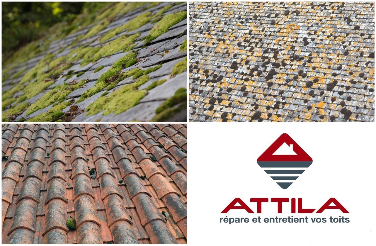 L’agence ATTILA GRENOBLE utilise des produits de traitement des toitures sur des matériaux en tuiles terre-cuite, tuiles en béton, et ardoises qu’elles soient naturelles ou artificielles. Nos produits sont prêts à l’emploi et les Techniciens de toiture ATTILA appliquent un seul produit pour diminuer le risque de confusion entre produits. Lorsqu’il y a une réaction colorée sur les mousses, cela signifie qu’il y a eu une bonne application. Plus votre toiture a besoin d’être traitée, plus la réaction est visible. Au bout de trente minutes, la réaction se prononce davantage sur le lichen jaune qui devient rose et sur les lichens blancs qui prennent alors une teinte verte. Le produit attaque rapidement les germes et la mousse qui se décollent tout seul. Le produit continue d’agir sur la toiture pendant une période de 6 à 9 mois.