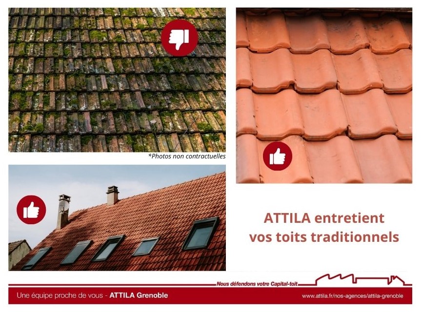 Savez-vous que mal entretenue, une toiture traditionnelle se dégrade beaucoup plus rapidement ? L’agence ATTILA GRENOBLE vous propose des visites régulières, ainsi que des réparations préventives en cas de besoin. Ainsi vous évitez de coûteuses réfections, et vous préservez le confort des occupants du bâtiment. En travaillant avec des professionnels qualifiés comme ATTILA, vous pouvez de plus justifier de vos dépenses d’entretien auprès de votre assureur, quand vous le solliciterez pour la prise en charge de dégâts dus par exemple à des événements météorologiques exceptionnels, des sinistres….