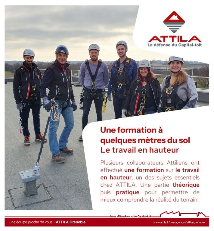 Les Techniciens de Toiture de l’agence ATTILA GRENOBLE sont sensibilisés en permanence sur le risque de chutes en hauteur lors de leurs interventions sur les toits. Leur comportement se doit d’être irréprochable à chaque instant.