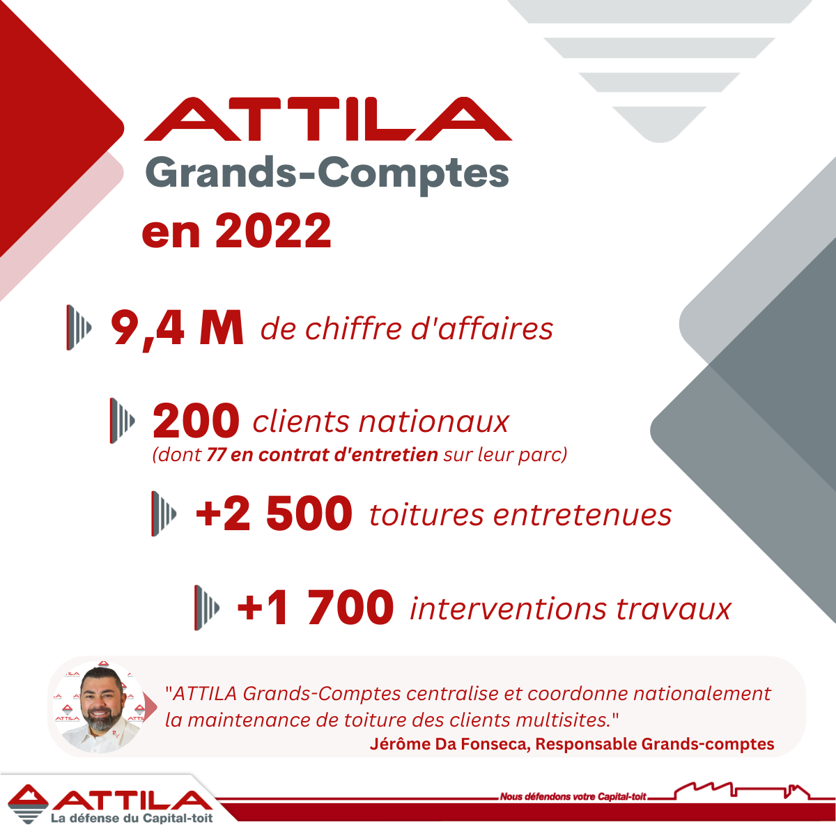 ATTILA, 1er réseau national de maintenance et réparation de toitures, dispose d’une organisation centrale dédiée, au service des entreprises multi-sites : le service Grands-Comptes. Celui-ci coordonne, sur le territoire métropolitain, l’ensemble des besoins d’intervention et la gestion des contrats d’entretien comme interlocuteur unique à la fois technique et commercial. La centralisation nationale garantit aux Clients Grands-Comptes la mise en œuvre de procédures, de normes et une qualité d’intervention homogènes partout en France.