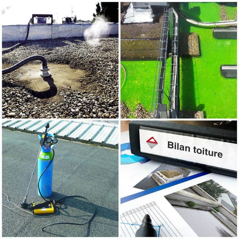 • La recherche par fumigène pour les terrasses lestées avec cailloux, gravillons : la machine envoie le fumigène entre deux couches d’étanchéité pour faire gonfler la 1ère couche. La fumée ressort s’il y a un défaut.