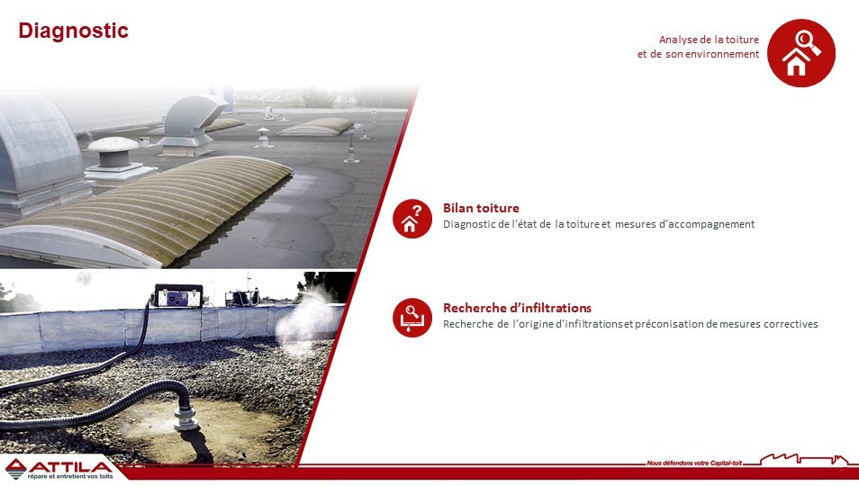 A l’issue de ce diagnostic nos équipes peuvent également être amenée à vous préconiser des améliorations futures pour votre toiture. Professionnels de l’industrie, gestionnaires de patrimoine, organismes privés et publics, équipés de toitures neuves ou anciennes, particuliers ? ATTILA prend en charge votre toit, que vous soyez locataire ou propriétaire de vos locaux.