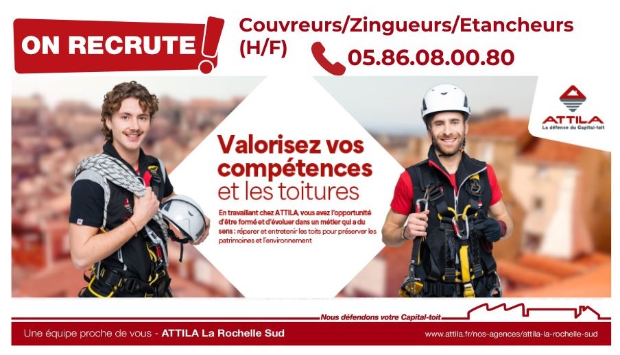 ATTILA LA ROCHELLE SUD RECRUTE DES COUVREURS/ZINGUEURS/ETANCHEURS – H/F