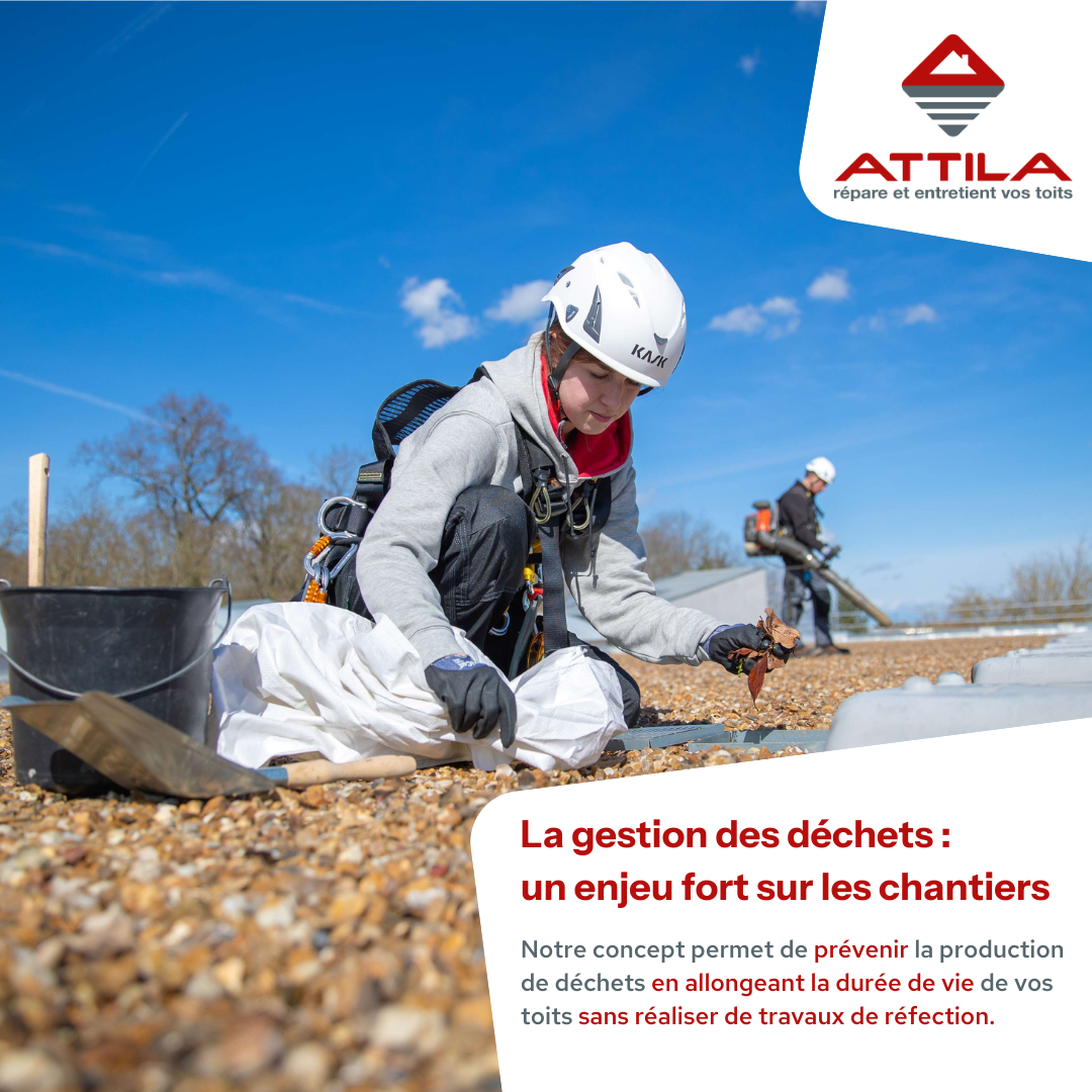 Nous sommes fiers de dire que depuis plus de 20 ans, ATTILA s’efforce de diminuer sa production de déchets sur ses chantiers puisque notre concept permet de prévenir leur production en allongeant la durée de vie de vos toits sans réaliser des travaux de réfection. Selon une étude réalisée par l'Observatoire de l'Immobilier Durable, il s’avère que remplacer une toiture double le poids carbone de la construction initiale, ce qui en fait une pratique à fort impact environnemental.