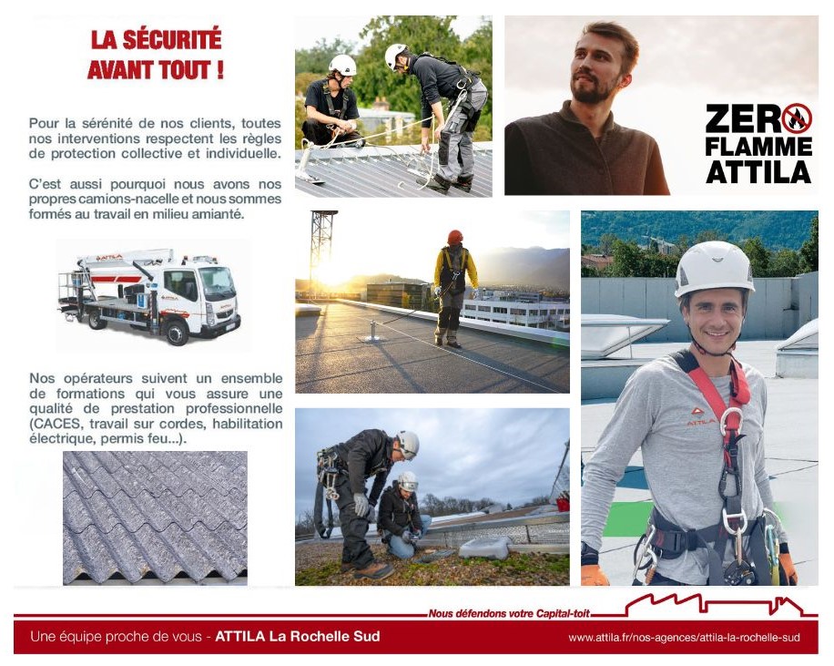 Lors de nos interventions sur vos toits, votre responsabilité comme la nôtre est engagée. C’est pourquoi, à l’agence ATTILA LA ROCHELLE SUD nous mettons en œuvre chaque jour, sans limitation de temps ni de coûts, tous les moyens techniques et humains pour assurer la sécurité des personnes et des biens. Nous considérons qu’aucune situation ou urgence ne peut justifier la mise en danger d’autrui. C’est pourquoi nous nous impliquons en permanence dans l’amélioration de la sécurité, la santé, et le bien-être au travail de tous nos collaborateurs. La qualité de notre politique de sécurité nous vaut d’ailleurs d’être appelés pour intervenir sur des sites dits « à hauts risques ».