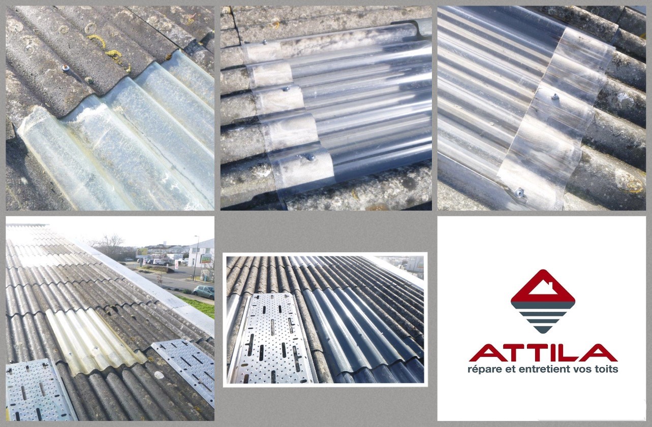 Lors de cette intervention les Techniciens de Toiture ATTILA ont réparé une plaque en utilisant les sécuriplaques et ainsi travailler en toute sécurité et sérénité. Pour ce type d’intervention sur des bâtiments construits avant le 1er juillet 1997, les clients doivent constituer et tenir à jour le Document Technique Amiante (DTA). Pour les habitations individuelles c’est le rapport de repérage amiante qui doit être fourni par le propriétaire.