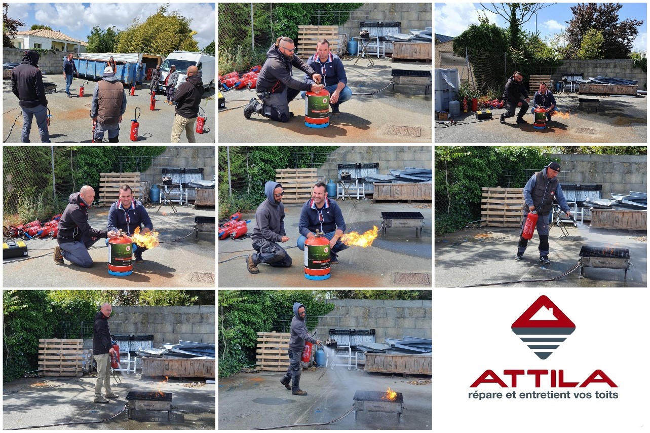 Pour rappel, on dénombre plus de 16 000 incendies survenus sur un lieu de travail, locaux et bâtiments professionnels, et 70% des entreprises victimes d’un incendie cessent leurs activité dans les mois qui suivent (source INRS). Chez ATTILA, la sécurité, sous toutes ses formes, est une priorité. Tous les moyens techniques et humains sont mis en œuvre, sans limitation de temps ni de coûts, pour assurer la sécurité des personnes et des biens. Et dans le prolongement des actions quotidiennes, comme les Équipements de protection individuelles ou collectives, le travail sans la flamme en toiture etc… des formations restent indispensables pour prévenir divers risques.