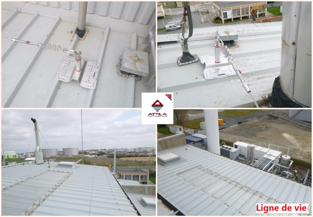 Tout d’abord la pose d’une ligne de vie, point d’ancrage de classe C. Ce dispositif est constitué d’au moins deux potelets fixés de façon permanente à la structure. Ils sont reliés par un câble tendu, sur lequel l’intervenant en toiture s’attache avec un système de liaison anti-chute. En effet, lors d’une intervention sur la toiture, il est indispensable de fournir aux intervenants des moyens de sécurité pour se protéger de la chute de hauteur. Ainsi, ils peuvent s’attacher et évoluer en toute sécurité sur les toits. Lorsque l’installation de protections collectives s’avère impossible ou inefficace (risque de chute à travers la toiture), il est préconisé de mettre en place des protections individuelles.