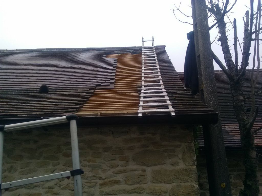 Réparation d'un toit traditionnel Dauphinois 14/02/2018 par Agence La Tour Du Pin Suite à chute de grêle remise en état du toit abîmé. Le matériaux utilisé est de la tuile plate.