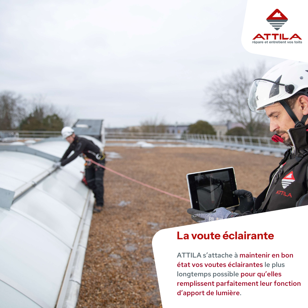 Nos Techniciens de Toiture ATTILA posent, entretiennent, réparent, ajoutent ou suppriment vos voutes éclairantes. Nous nous chargeons également de leur entretien afin de les maintenir en bon état le plus longtemps possible, notamment en vérifiant leur étanchéité. Nous nous appuyons pour cela sur un contrôle visuel au moins une fois par an de vos dispositifs d’éclairage.