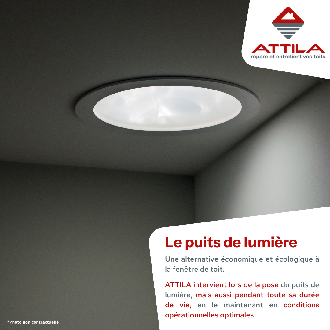 Nos Techniciens de Toiture ATTILA posent, entretiennent et réparent votre puits de lumière. Si celui-ci est endommagé (dôme cassé par exemple ou dysfonctionnement du conduit), chacun de ses éléments peut-être remplacé séparément, ce qui représente un avantage certain.