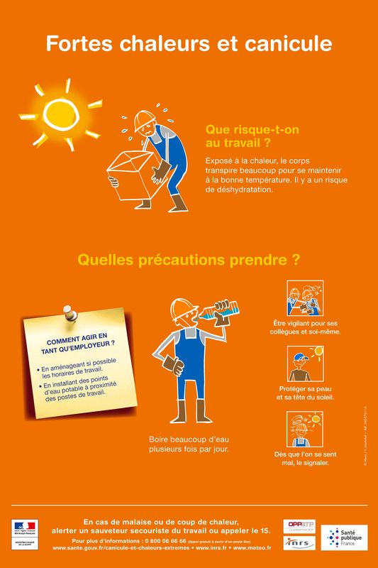 Quels sont les risques ?De nombreux signes d’alertes sont à prendre en compte sans minimiser, car ils risquent d’entrainer un gros coup de chaleur (élévation de la température du corps). Cela peut provoquer des malaises et faire risquer la chute : irritabilité, propos incohérents, grande fatigue, peau rouge, chaude et sèche, crampes musculaires, vertiges, maux de tête, nausées, soif intense, fièvre… Les coups de soleil, les insolations ou encore les coups de chaleur et la déshydratation sont des risques importants liés à ces conditions climatiques exceptionnelles.