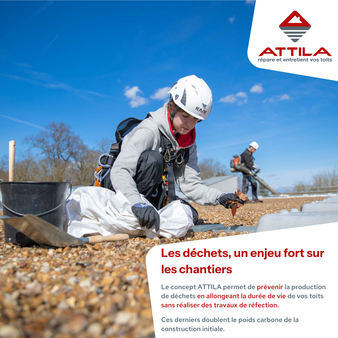 Par son concept, cela fait plus de 20 ans qu’ATTILA s’engage en faveur de l’environnement. En effet, nous nous efforçons de diminuer notre production de déchets sur nos chantiers puisque notre raison d’être permet de prévenir la production de ces déchets en allongeant la durée de vie de vos toits sans réaliser des travaux de réfection. Car selon une étude réalisée par l'Observatoire de l'Immobilier Durable, remplacer une toiture double le poids carbone de la construction initiale, ce qui en fait une pratique à fort impact environnemental.