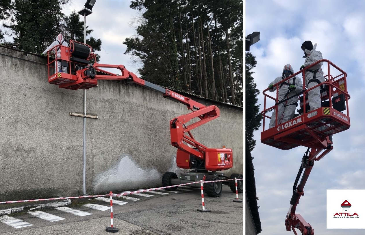 Les Techniciens de Toiture des agences ATTILA LYON SUD ont réalisés cette intervention sur une toiture avec plaques amiantées en fibrociment. L’intervention en tête de mur de ce toit a été menée sur une nacelle et en respectant les règles les plus strictes de sécurité, notamment dans l’équipement de protection respiratoire, obligatoire lors de manipulation de plaques amiantées.