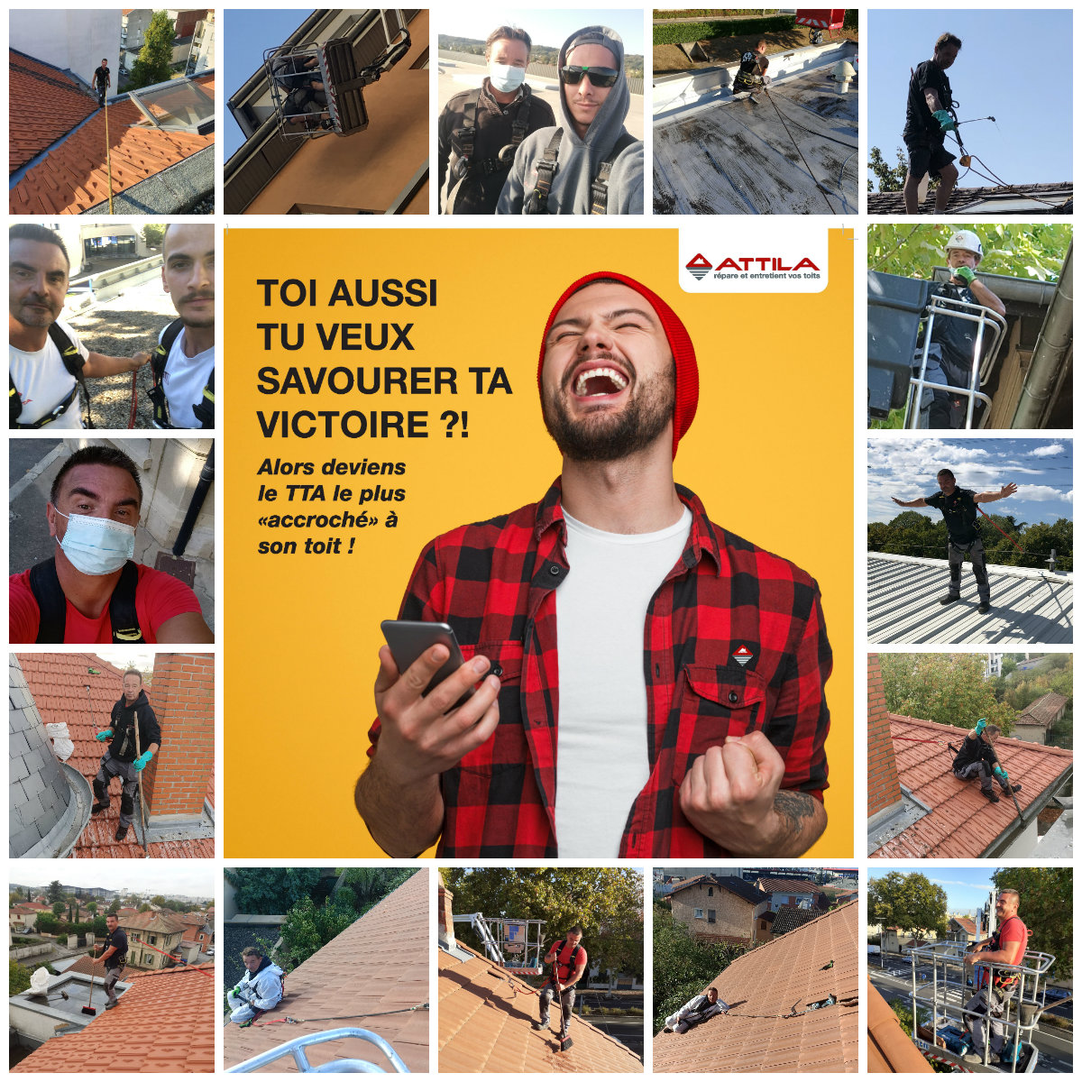 Les Techniciens de Toiture ATTILA ont pour mission quotidienne de se prendre en photo en situation de mise en sécurité à travers différents thèmes :