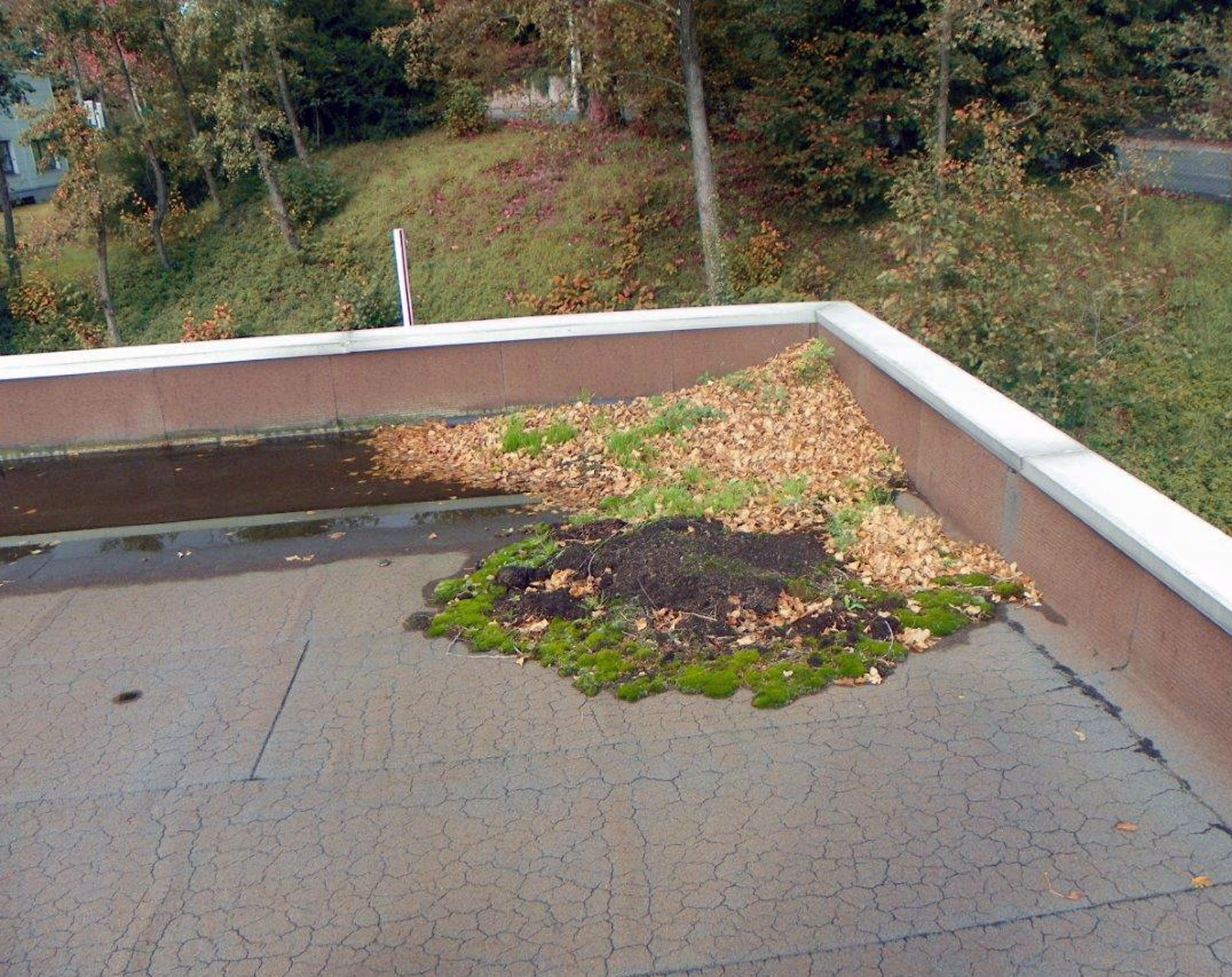 APPARITION DE VÉGÉTAUX DE TAILLE IMPORTANTEL’évacuation des feuilles ne se fait pas naturellement, compte-tenu de l’absence de pente. La stagnation des végétaux en décomposition va devenir le terrain idéal pour accueillir des végétaux de plus en plus importants voire même des arbustes qui peuvent percer certaines étanchéités. La dégradation qui en résulte demande suivant l’état un traitement, réparations ponctuelles ou réfections partielles.