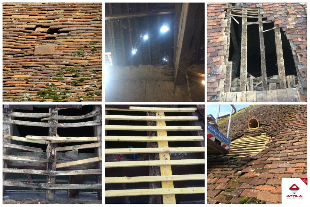 La remise en place de tuiles décalées ou manquantes, notamment derrière la cheminée, et sur d’autres parties du toit à diverses endroits.