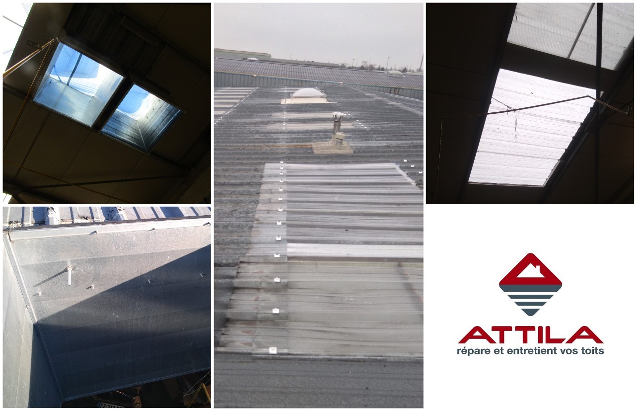 C’est le cas pour cette intervention sur une toiture industrielle en bac acier. Les Techniciens de Toiture ATTILA ont ajouté des plaques translucides en remplacement de bouches d’aérations.