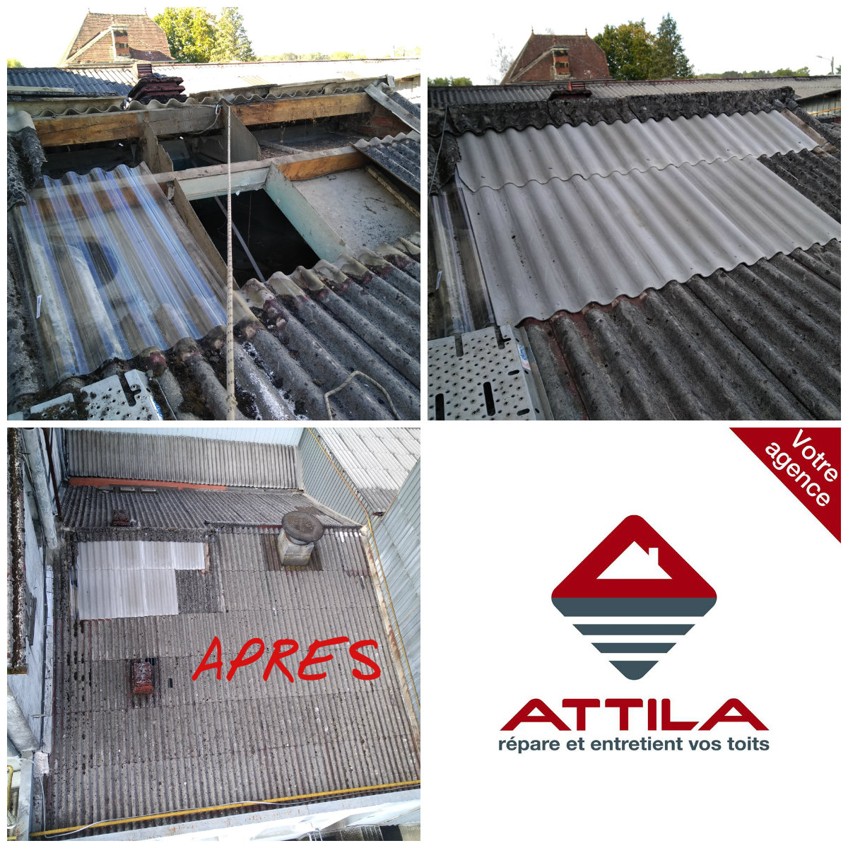 L’agence ATTILA MONTARGIS est habilitée à intervenir pour de la réparation et de la maintenance en milieux amiantés. Après avoir retiré les plaques défectueuses, les Techniciens de Toiture ATTILA ont pu réparer la fuite et replacer de nouvelles plaques. Sur ces types de toiture en fibrociment ou en ardoise artificielle comportant de l’amiante, nous intervenons pour réparer ou pour effectuer un entretien de la toiture ou du chéneau. Les conditions de l’intervention sont extrêmement strictes c’est-à-dire avec tous les moyens de protection nécessaires conformément à la législation.