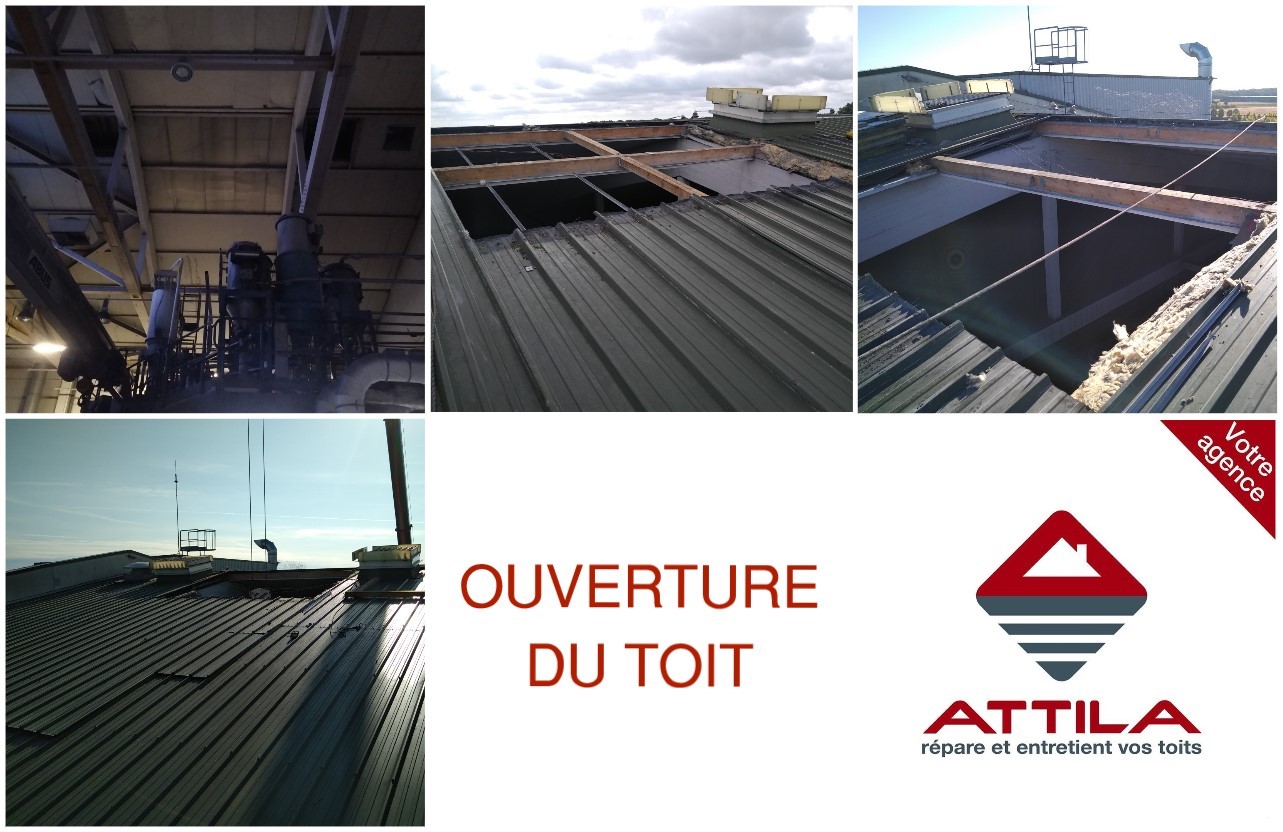 Aussi les Techniciens de Toiture ATTILA réalisent cette intervention de façon très organisée, et avec le plus grand soin : dépose d’une partie du toit en bac acier, des polycarbonates, de l’isolant et des renforts. Des actions périlleuses qui doivent être orchestrées au millimètre près. Pendant l’absence de la machine, et afin notamment de protéger l’intérieur du bâtiment des intempéries, la partie béante est mise hors d’eau en replaçant le bac acier, et la zone est balisée.