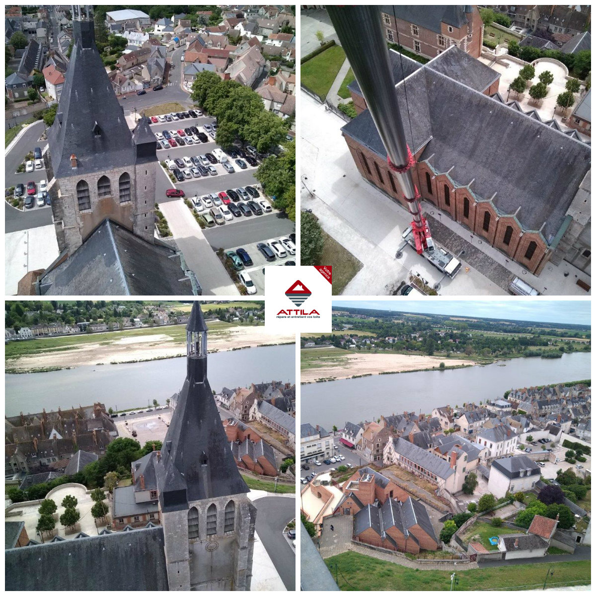 Chantier balisé, matériel adapté, les Techniciens de Toiture ATTILA harnachés et travaillant en toute sécurité, des impératifs pour réaliser ce type d’intervention. Atteindre le sommet, réparer et préparer les surfaces à combler, remettre les ardoises manquantes, et par la même occasion, profiter de la vue magnifique sur la Loire et la ville de Gien.
