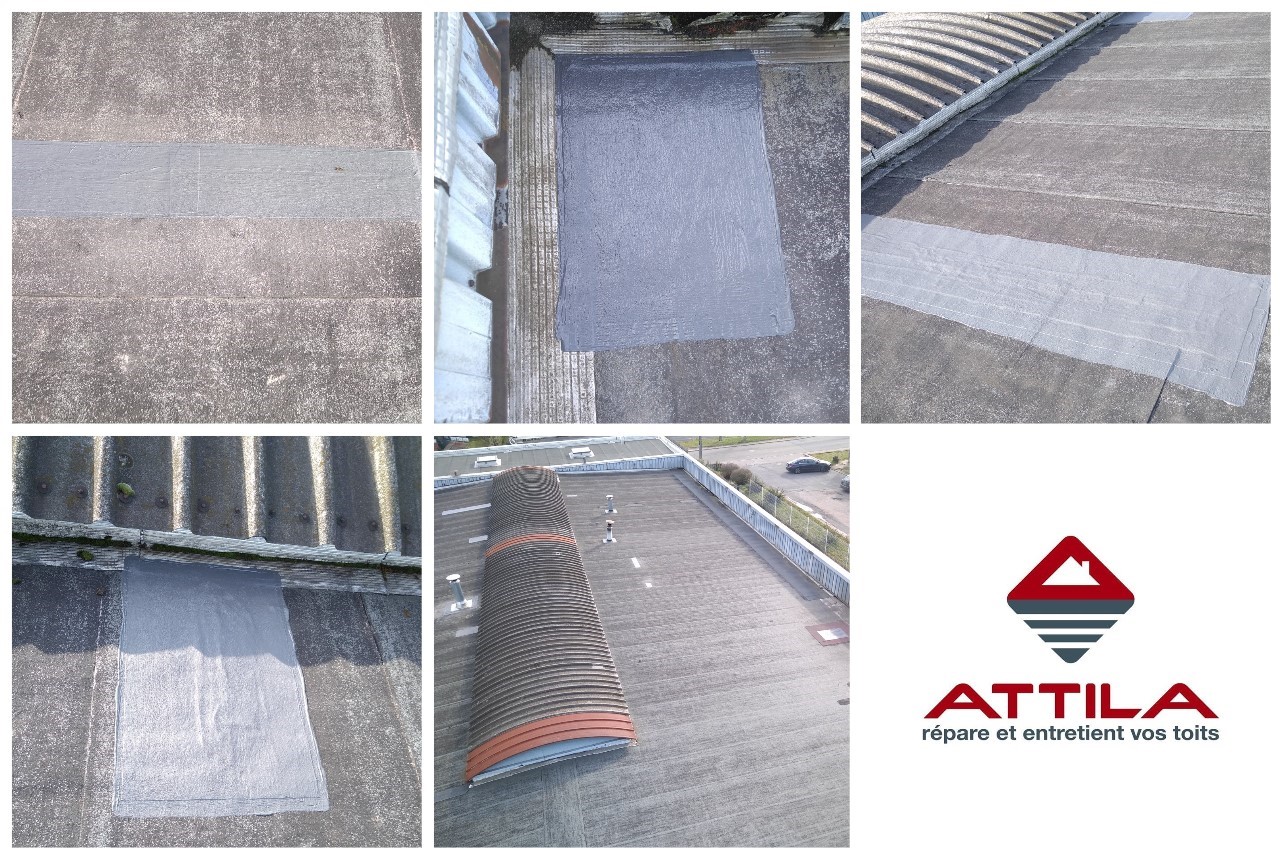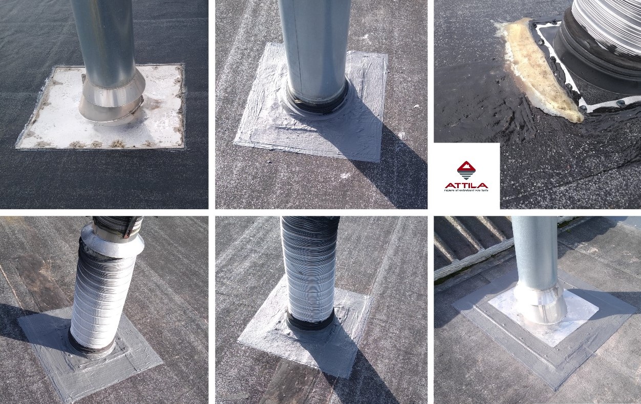 Lors de cette intervention, l’agence ATTILA MONTARGIS a réalisé des réparations pour parer à l’urgence afin d’éviter de grosses problématiques en toiture et à l’intérieur des bâtiments, notamment des infiltrations et des fuites d’eau. Les principaux problèmes étaient principalement situés autour des cheminées où l’étanchéité bitume craquait, se fissurait, laissant même apparaitre l’isolant. Des patchs ont été appliqués en attendant la réfection totale.