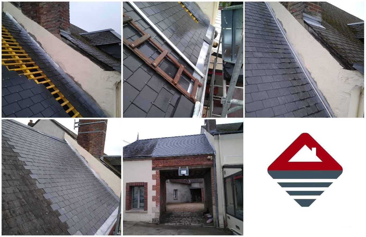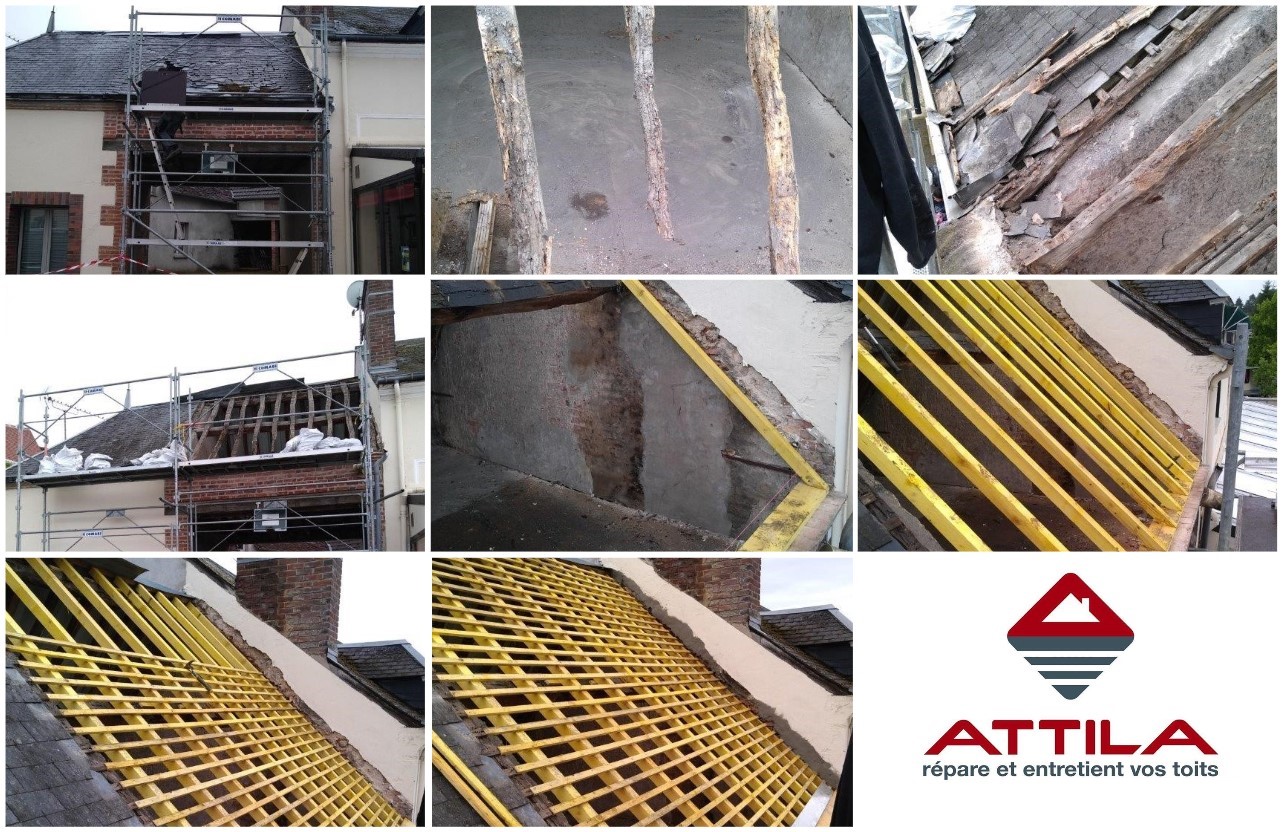 Lors de cette prestation, les équipes de l’agence ATTILA MONTARGIS ont du mettre de nombreuses compétences au service de ce laboratoire. Pour des réparations sur une partie de la toiture, ils ont d’abord regardé et vérifié que la charpente était prête à recevoir de nouveau une couverture. Et là, mauvaise surprise, elle n’était pas du tout en état pour accueillir de nouvelles ardoises ! Un grand nombre de chevrons (utilisés pour recevoir l’élément porteur du matériau de la toiture) étaient manquants ou abîmés.