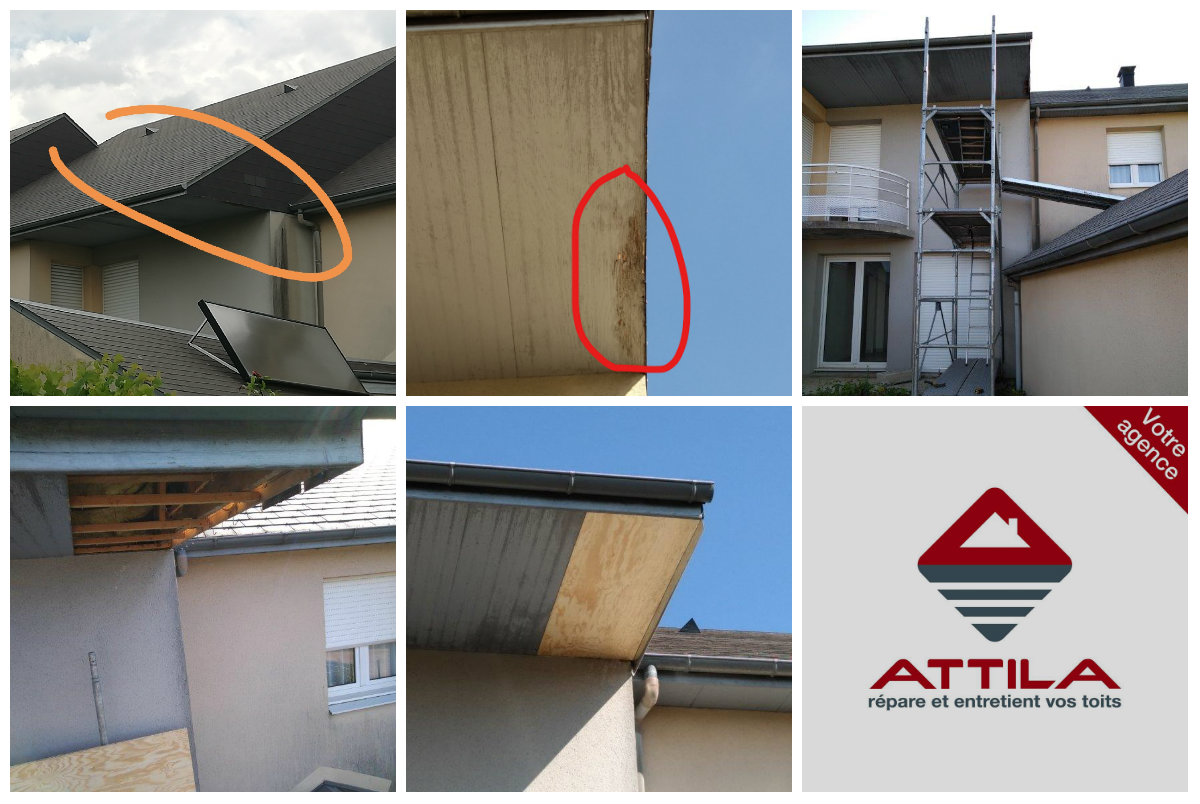 Une pièce était manquante sur le pignon droit de l’habitation ce qui avait pour conséquence que l’eau ne s’écoulait plus au bon endroit mais sous la sous-face qui, en bois, pourrissait peu à peu. Ainsi, il a été détecté six endroits à réparer. Ce n’est qu’après le bilan de toiture que les réparations ont pu commencer avec la certitude que la problématique était entièrement réglée.