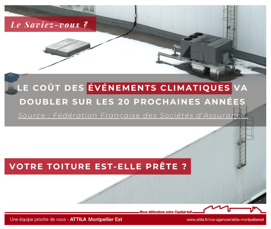 Une étude publiée par la Fédération Française des Sociétés d'Assurance (FFSA), montre que le coût des événements climatiques va doubler sur les 20 prochaines années passant ainsi de 34 milliards à 60 milliards d’euros ! Attention aux infiltrations en toiture qui peuvent mettre en péril vos équipements, vos stocks, votre bâtiment, et même toute votre activité.
