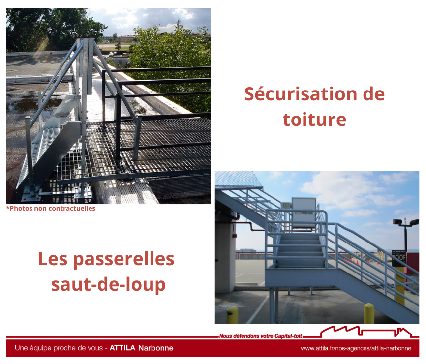 - ATTILA NARBONNE remplace et/ou met aux normes vos passerelles et sauts-de-loup : Nous créons, remettons aux normes voire remplaçons complètement vos passerelles de travail ou de circulation pour que ces dispositifs soient -toujours- en conformité. Ainsi, la sécurité des intervenants amenés à circuler sur la toiture est renforcée. Nos experts étudient l’environnement et le public amené à utiliser ces équipements de sécurité collective.