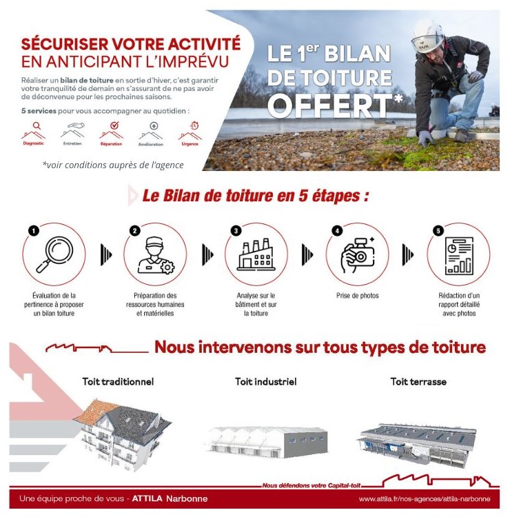 En ce moment, l’agence ATTILA NARBONNE vous offre* votre premier bilan de toiture.
