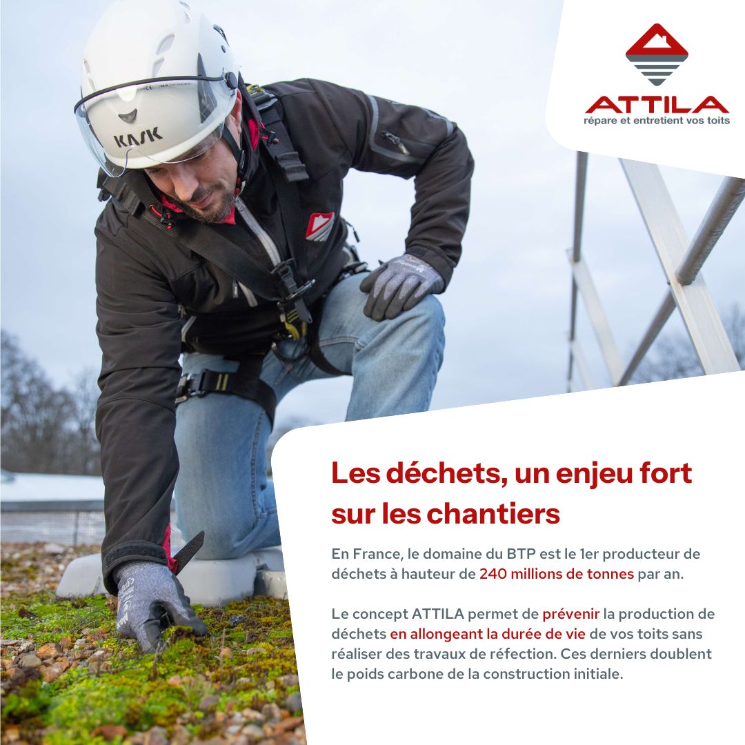 En effet, le réseau s’efforce à diminuer sa production de déchets sur ses chantiers puisque notre concept permet de prévenir la production de déchets en allongeant la durée de vie de vos toits sans réaliser des travaux de réfection. Car selon une étude réalisée par l'Observatoire de l'Immobilier Durable, remplacer une toiture double le poids carbone de la construction initiale, ce qui en fait une pratique à fort impact environnemental.