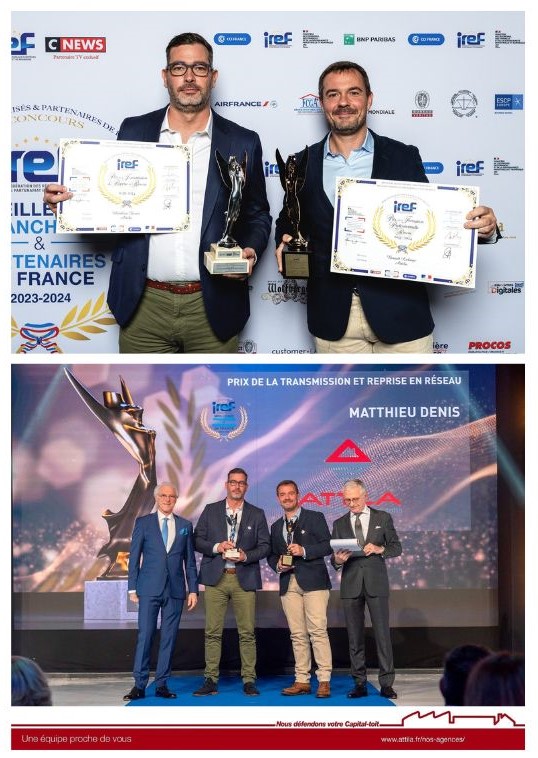 Benoit LAHAYE, Président Fondateur ATTILA a reçu le trophée de la formation professionnelle en réseau, et Matthieu Denis, gérant franchisé de l’agence ATTILA POITIERS NORD, celui de la transmission et reprise en réseau.
