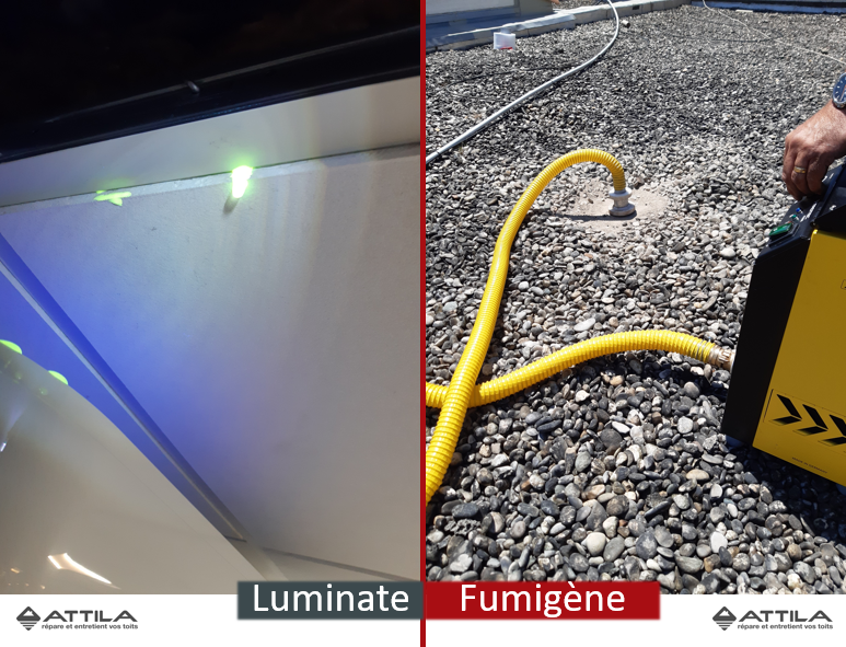 - Recherche par fumigène pour les terrasses lestées avec cailloux, gravillons : la machine envoie le fumigène entre deux couches d’étanchéité pour faire gonfler la 1ère couche. La fumée ressort s’il y a un défaut.