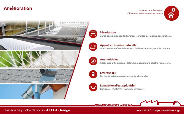 L'agence ATTILA ORANGE sécurise votre toiture et en améliore certains aspects par une expertise qui vous permet de gagner en confort de travail, en luminosité, en économies d’énergie, et de préserver les matériaux de couverture. Nos équipes vous conseillent sur des projets d’amélioration de votre bâtiment ou habitation.
