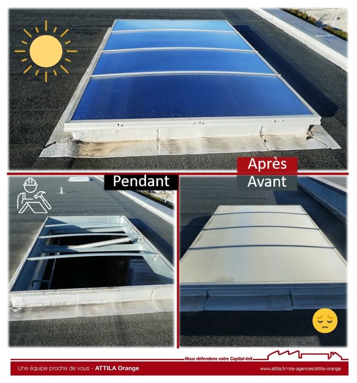 L’équipe de l’agence ATTILA ORANGE est intervenue sur la voute éclairante de ce client pour un remplacement de polycarbonate. En effet, celui-ci était devenu vétuste et ne remplissait plus sa fonction d’apport en lumière.