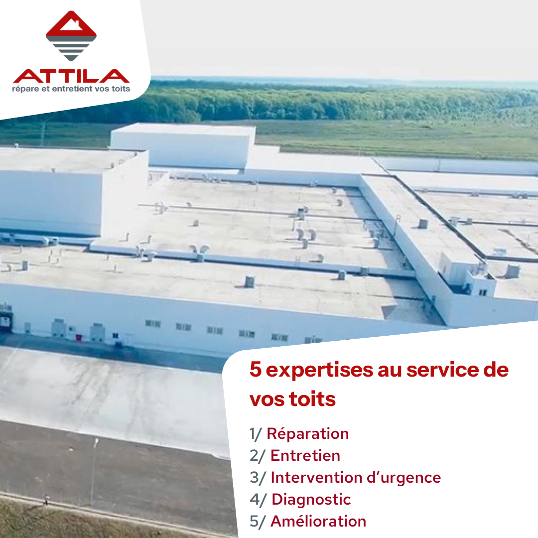 ATTILA est le 1er réseau national spécialisé dans la réparation, l’entretien et la maintenance de tous les types de toits, qu’ils soient industriels, traditionnels, en terrasse ou amiantés.