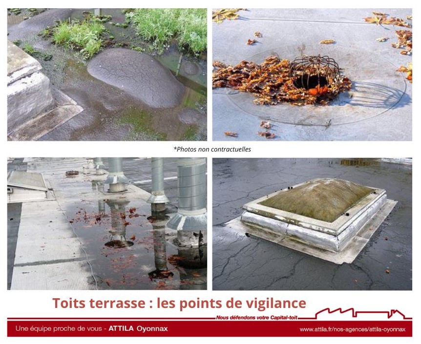 Zoom sur les points de vigilance d’une toiture terrasse. Celle-ci se caractérisé par son aspect plat avec une très légère pente, entre 0 et 3 %, pour acheminer les eaux pluviales vers les chéneaux d'écoulement. Du fait de cette platitude, l'eau stagne beaucoup plus que sur n'importe quel toit. Son nettoyage annuel est donc une nécessité absolue afin d'éviter tout dégât des eaux et la détérioration prématurée des matériaux qui composent ce type de couverture.