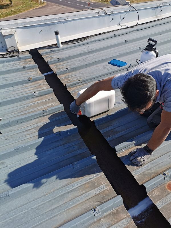 Après localisation et réparation de la fuite les couvreurs-étancheurs d’Attila Périgueux effectuent un test d’étanchéité par la mise en eau de la zone réparée.
