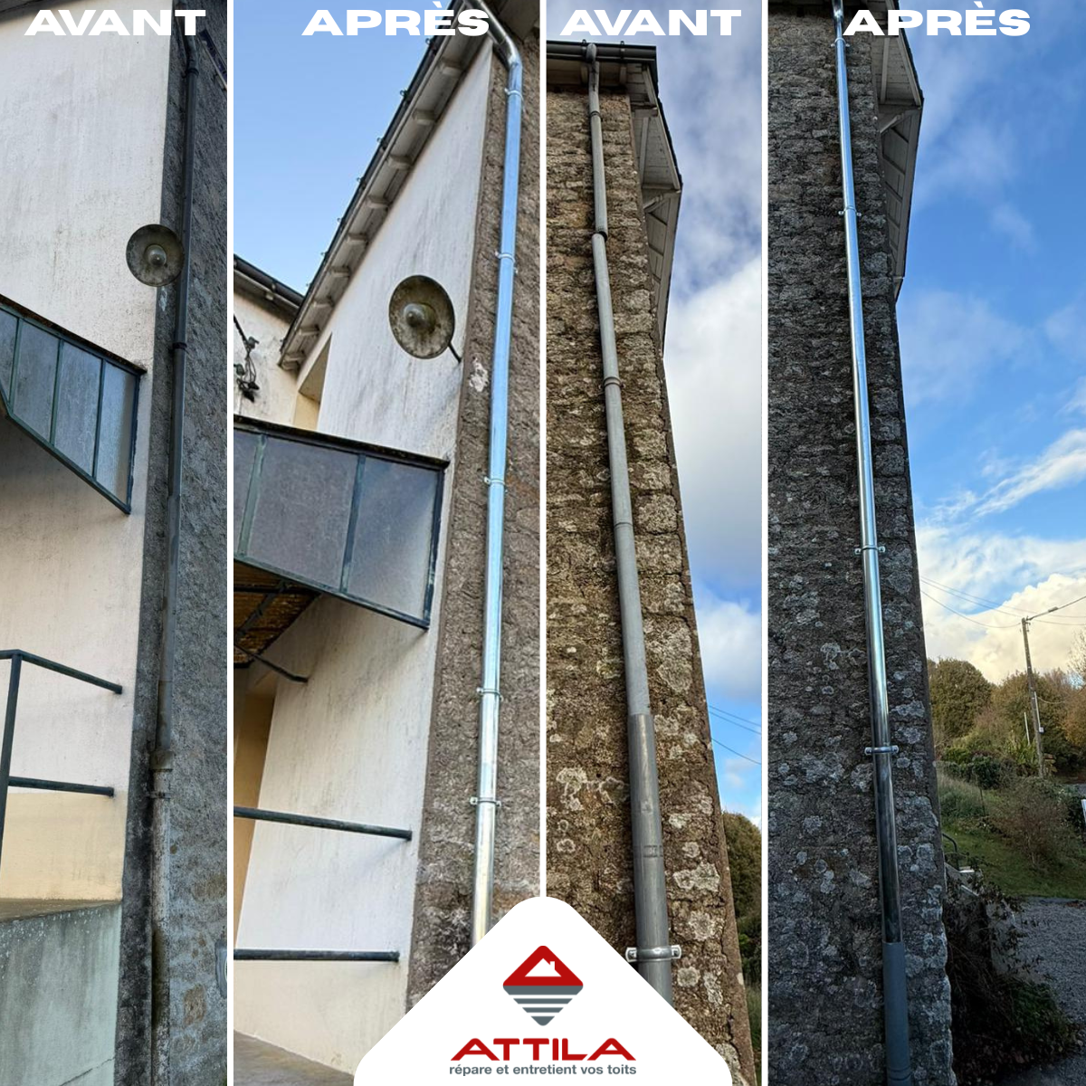 Le remplacement des tuyaux de descente permet de rétablir une évacuation efficace et sécurisée des eaux de pluie. Après intervention, le bâtiment bénéficie :