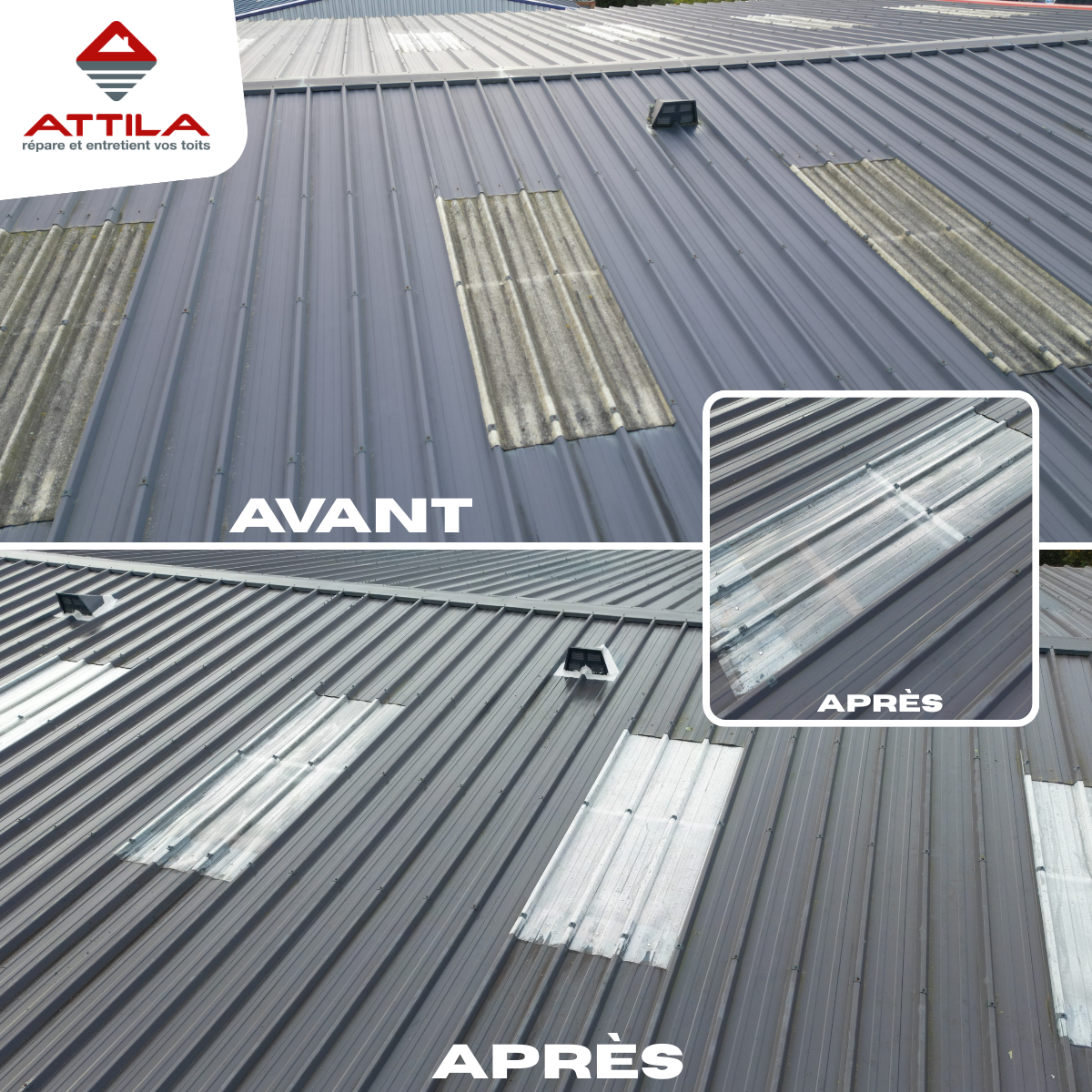 Pour répondre à ces problématiques, nos équipes ont procédé au remplacement des translucides dégradés par des éléments neufs, adaptés à la toiture existante. Cette intervention a permis de rétablir un apport de lumière naturelle optimal tout en améliorant la durabilité et la sécurité de la couverture.