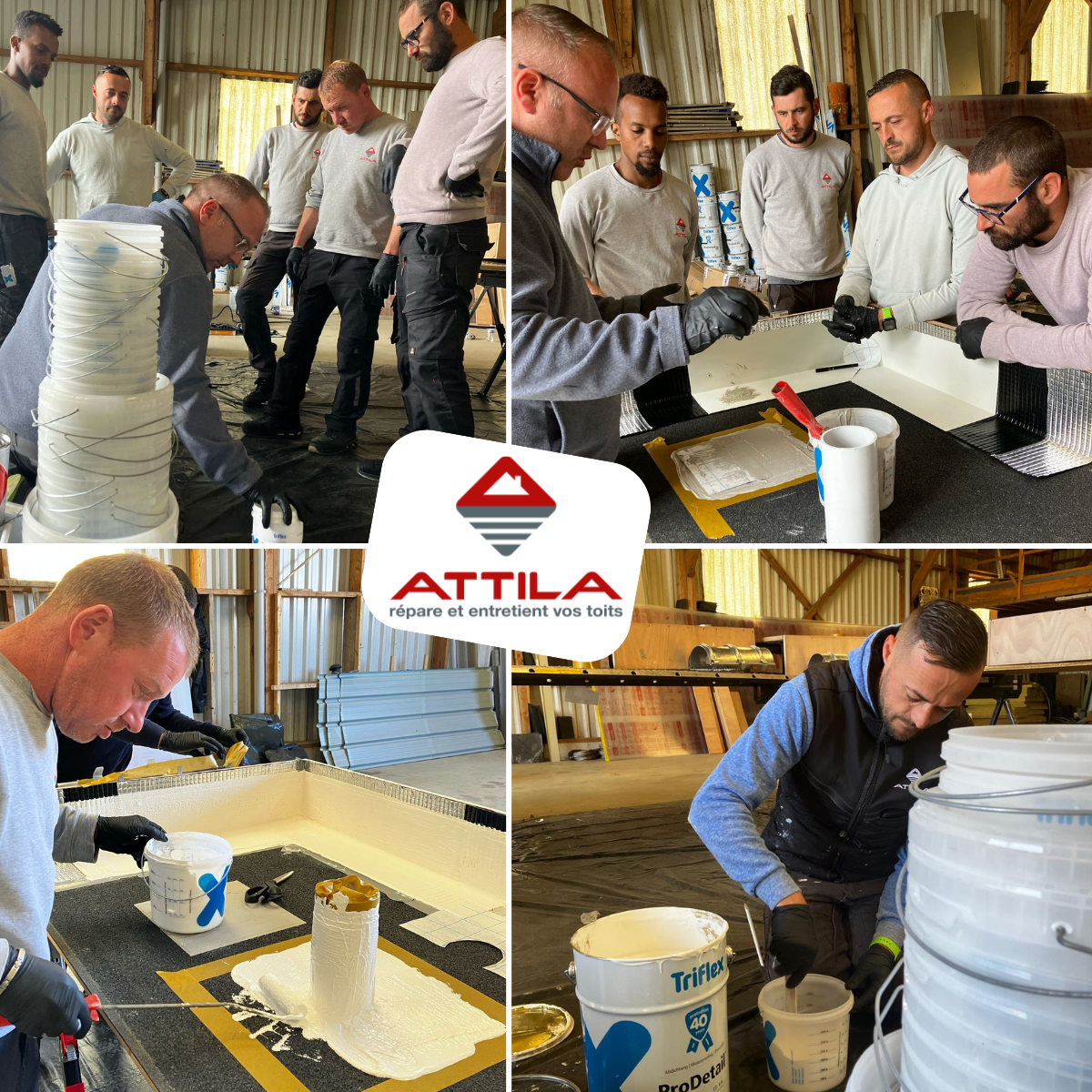 Chez ATTILA, nous sommes convaincus qu’un chantier réussi commence par une parfaite maîtrise des techniques et des matériaux utilisés. C’est dans cet esprit que Jimmy et Ronan nos Techniciens de Toiture ainsi que Julien et Faiz ceux de l’agence Attila Vannes Ouest, ont récemment suivi deux jours de formation complète sur la résine Triflex.